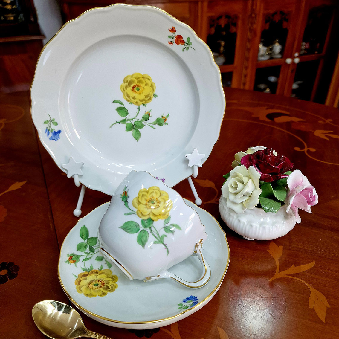 ไมซนเยอรมันแท้ งานโบราณแท้ ที่หายาก และ น่าสะสมคะ อายุมากกว่า 90-100ปี เนื้อแร่ผสมทองคำแท้คะ เป็นพอร์เลน ที่เนื้อแข็งที่สุดในโลก ตามคำบอกเล่าคะ เนื้อเงาสุดๆ ขนาดใหญ่ น่าใช้ น่าหลงไหล สุดๆคะ กุหลาบสีเหลือง ขอบทอง มีเอกลักษณ์ พิเศษ หูจับ งดงาม มากๆคะ ขนาด สูง2.5” หรือ 6 ซ.ม กว้าง3.5” หรือ8ซ.ม จานรองกว้าง6.5” จานขนมกว้าง 7.5” งานสมบูรณ์หรูหราน่าใช้ สุดๆคะ พร้อมส่งคะ สนใจยินดี ส่งฟรีคะ การันตี สวยและหายากสุดๆคะ