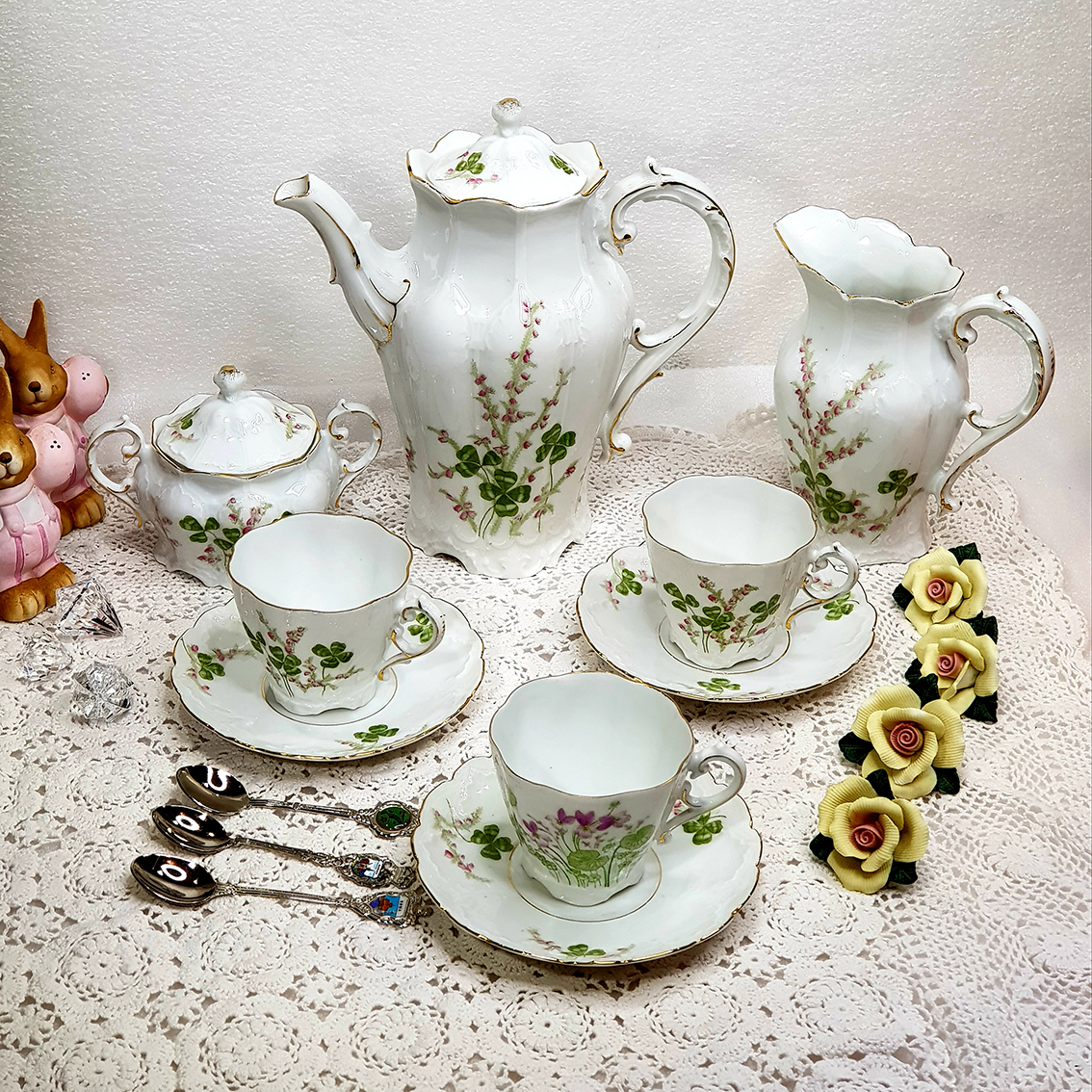 ชุด สำหรับ กาแฟ หรือ ชาได้ค่ะ เนื้อพอร์เซเลน งาน เยอรมันแท้ค่ะ ขอบทอง งดงาม เนื้อบาง 3 ดูโอ 1 โถน้ำ 1กา 1โถน้ำตาล แก้ว 3 ใบ จานรอง 3 ใบ รูปทรง งดงาม สภาพดี 99% ค่ะ มีบิ่น ข้างในฝาเล็กน้อย แต่พอปิดฝา จะมองไม่เห็นค่ะ สีสด อายุ 100 ปีอับค่ะ สวย มากๆค่ะ มีเสน่ห์ น่าหลงไหล น่าใช้ น่า สำผัส สุดๆค่ะ ยุโรปแท้ ค่ะ ขนาด กาสูง 8 นิ้ว กว้าง 5.5 นิ้ว กาน้ำ สูง 6 นิ้ว กว้าง 4.5 นิ้ว โถ น้ำตาลสูง 3 นิ้ว กว้าง 4 นิ้ว แก้ว สูง 2.5 นิ้ว กว้าง3 นิ้ว จานรอง กว้าง 5.6 นิ้ว ค่ะ 11 ชิ้น ตกชิ้นละ 817 บาท บริการฟรี ถึงไทยแล้วค่ะ