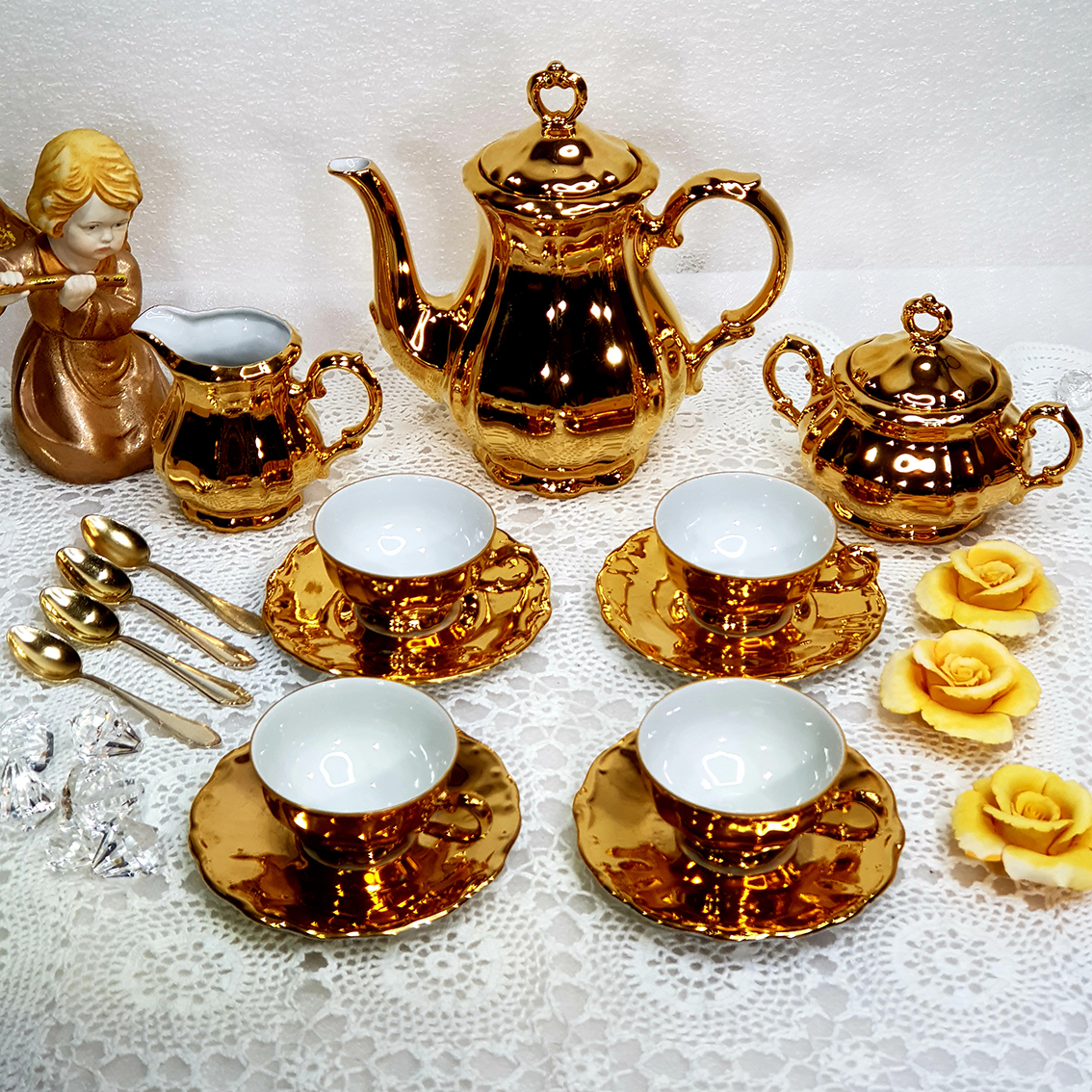 ชุดทองคำ ล้วน สำหรับ ชาหรือกาแฟค่ะ บาวาเรีย เยอรมันแท้ เนื้อพอร์เซเลน ทองแท้ งดงามหรูสุดๆค่ะ เนื้อทอง 18-22 เค ค่ะ สภาพทองดี 100% งานดี100% น่าใช้ น่าหลงไหล ยิ่งโดนแสง ยิ่งเงาวาว สุดๆ ค่ะ การันตีค่ะ 4 ดูโอ 1กา 1 โถนม 1 โถน้ำตาลคะแก้ว 4 ใบ จาน 4 ใบ กาขนาดสูง 8 นิ้ว สูงถึงฝากค่ะ กว้าง 5 นิ้ว โถนม สูง 3 นิ้ว กว้าง 3 นิ้ว โถน้ำตาล กว้าง 4 นิ้ว สูง 4 นิ้ว สูง ถึงฝา นะคะ แก้ว สูง1.5 นิ้ว กว้าง 2.5 นิ้ว ค่ะ รวม 13 ชิ้น ตกชิ้นละ999 บาท เองค่ะ บริการส่งฟรีค่ะ พร้อมถึงไทยละค่ะ