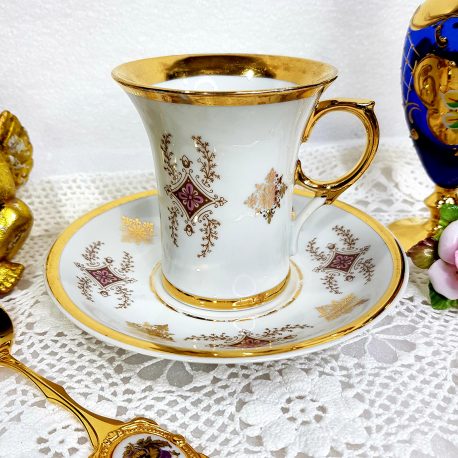 แก้วกาแฟ โบราณ อายุรุ่นยายชวด 90ปี รูปทรงสวย งดงามสภาพ แก้วทองดีทองเต็ม เต็ม จานรองทองหายบ้าง 10% เนื้อพอร์ซเลน เซรามิค งานของสวิสเซอร์เลนค์ค่ะ ขนาดสูง 3.5นิ้ว กว้าง 3นิ้ว จานรองกว้าง 5.5นิ้ว บริการส่งฟรี