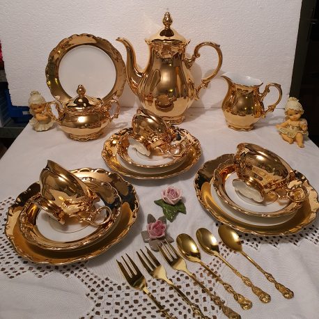 ชุดทอง คำ งาน เยอรมันแท้คะ งานโบราณ อายุ 80-90ปีคะ งดงามสุดๆ คะ เนื้อทอง พอร์เซแลนแท้ ที่สวยหรู สุดๆคะ กา ใบใหญ่สุดๆ แก้วสามใบ จานขนม 4ใบ โถนม โถน้ำตาล รวม15ชิ้น งานดีการันตีคะ มีตำนิทองหายบ้าง2-3%คะ สมบูรณ์ไม่แตกไม่บิ่นไม่ราวคะ ขนาดกาสูง10″ สูงถึงฝา กว้าง6″ โถนมสูง4.5″ กว้าง3.5″ โถน้ำตาล กว้าง 5″กว้าง4.5″ แก้วสูง 2″ กวเาง4″ จานรองกว้าง 5.9 “จานขนมกว้าง 7.5″คะ พร้อมส่งคะ บริการฟรีถึงไทยละคะ