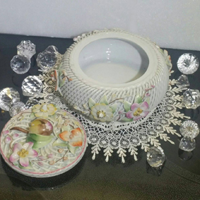 เป็นงานเชรามิกเนื้อเนียนงานของยุโรปโบราณหายากค่ะดอกไม้ครบไม่มีแตกหักงานเลิศค่ะ